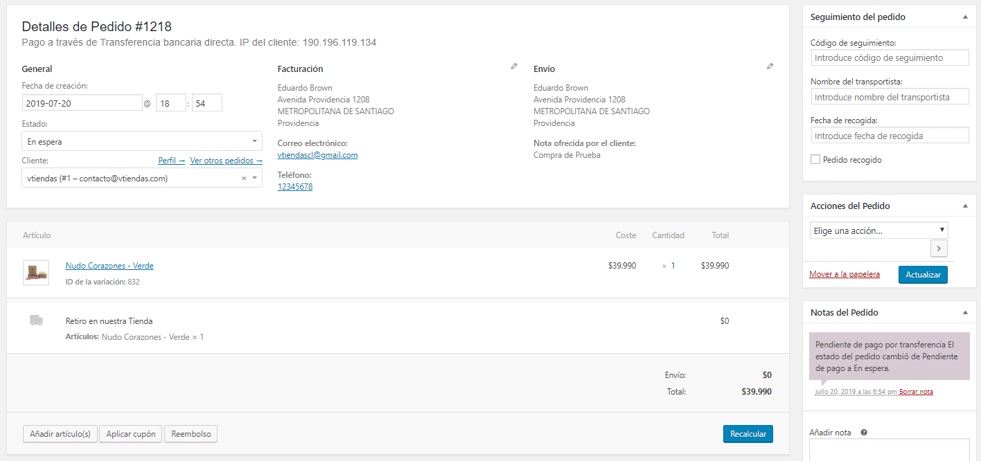 Ahí podemos ver los detalles generales, los de facturación y los de envío. Pero más importante aún, podemos modificarlos.