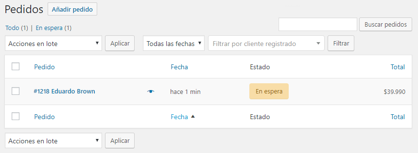 - Acciones en lote: Nos permite aplicar la misma acción a todos los pedidos que tengamos seleccionados: Mover a la papelera, marcar como procesando, marcar como en espera, o marcar como completo.