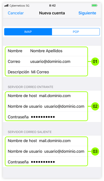 A continuación, debemos colocar los datos que corresponden al servidor con los elementos de nuestra cuenta de correo electrónico. Una vez llenes todos los campos, presionamos en Siguiente: