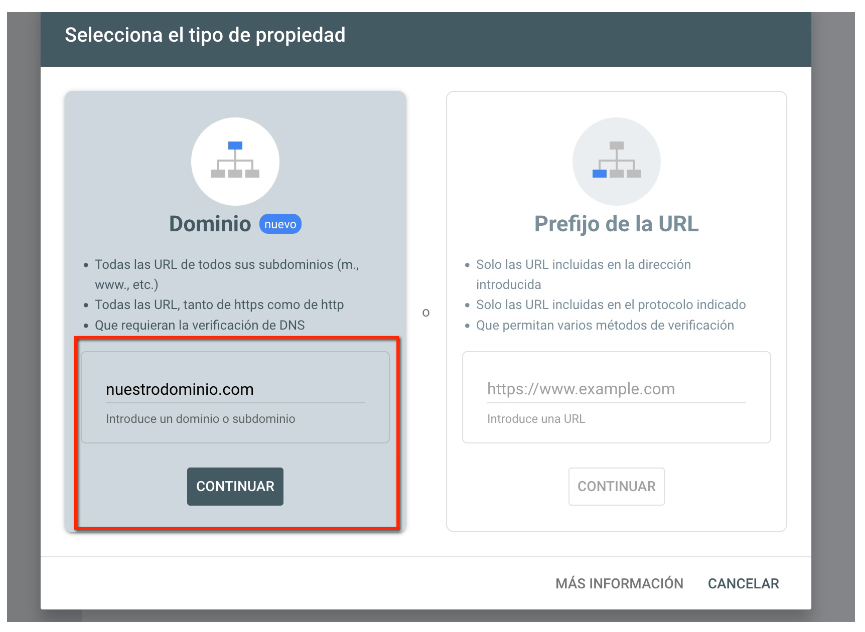 Cuando configuramos el dominio, tenemos acceso a toda la información y todas las variantes (dominios con www y sin www, http, https…) por ello es la opción que recomendamos, si configuras solo el prefijo, deberás dar de alta cada combinación posible lo que supone un mayor esfuerzo y los datos quedarán segregados en diferentes perfiles de sitio.
