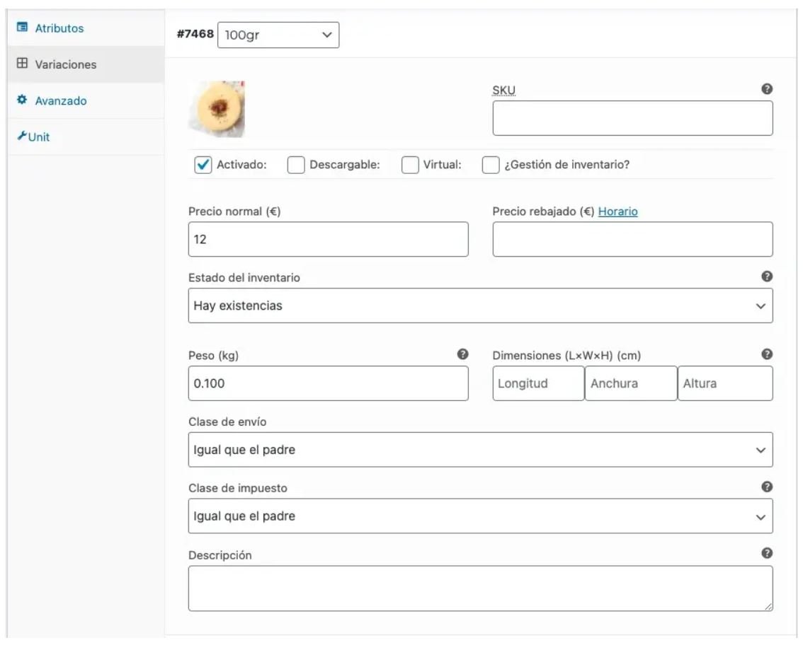 Ahora solo tienes que crear variaciones para todos los atributos y editar cada variación con su imagen, peso, precio, etc.