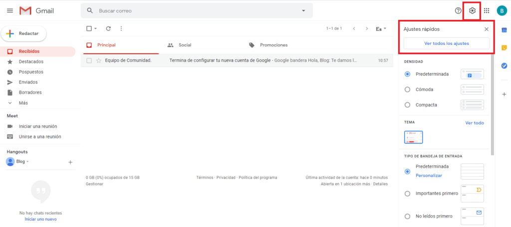 Lo hacemos desde la rueda dentada que tenemos en la parte superior derecha. Al clicar nos aparecen distintas opciones de configuración, pero debemos clicar en “Ver todos los ajustes”.