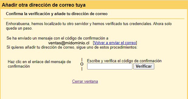 Si todos los datos introducidos son correctos pasamos a la siguiente pantalla del asistente donde nos solicita que introduzcamos un código que nos han enviado a la cuenta de correo corporativo que queremos configurar en Gmail.