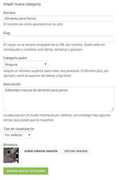 Ahora solo queda completar los datos correspondientes a la categoría que deseamos crear.