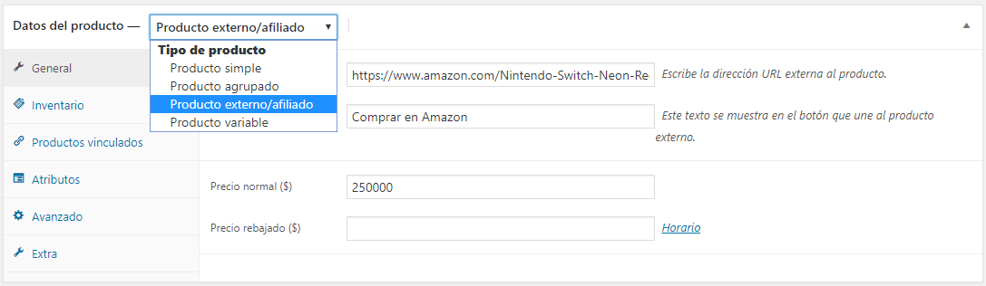 Lo único que tienes que hacer, diferente a otro tipo de producto, es seleccionar que será del tipo Externo/Afiliado, con lo que se te mostrarán los campos específicos de este tipo de producto.