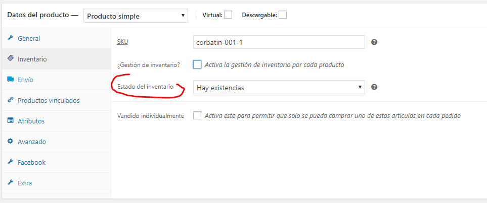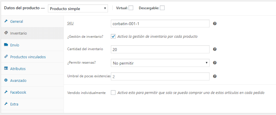 • Vendido individualmente: Si activamos esta casilla este producto sólo se podrá vender de uno en uno, y el cliente no podrá elegir el número de unidades ni en la página de producto ni en el carrito.