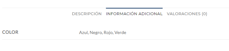En el momento en el que establecemos atributos y seleccionamos la casilla «Visible en la página de productos» los podemos ver en la pestaña de «Información adicional» debajo del producto: