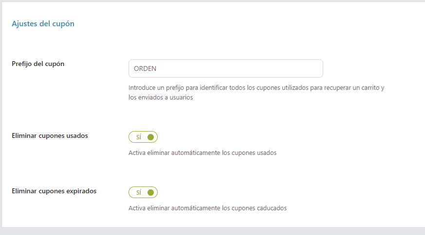 - Eliminar cupones usados: habilite esta opción para eliminar automáticamente los cupones usados.